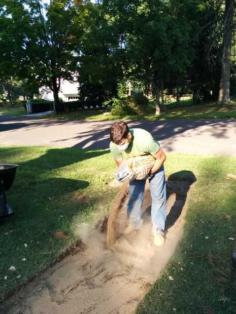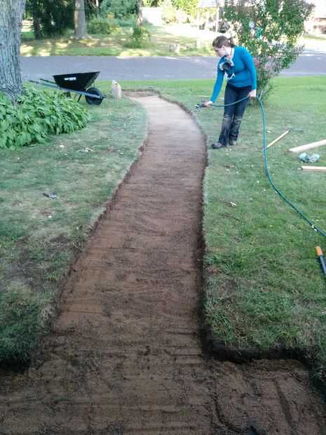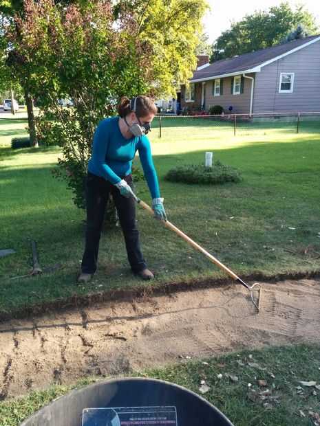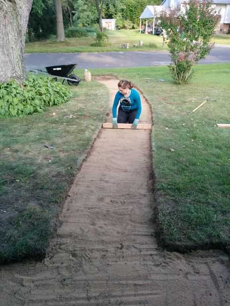 Ahora, un bolso a la vez, vertiendo la arena * a lo largo de la ruta de inicio. Rastrillo hacia fuera para llenar uniformemente los bordes, atraviesan el 2 x 4 para alisar la superficie e incluso a cualquier protuberancias, rociarlo con agua abajo y empújelo hacia abajo. Quizás tenga que repetir esto una vez o dos veces para asegurarse de que llegar a un espesor de cualquier lugar de 3/4" a 1.5" dependiendo del diseño de su trayectoria.