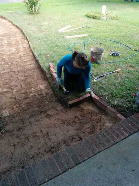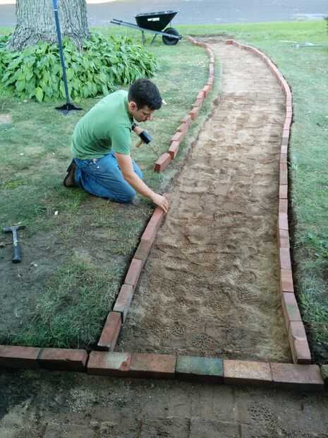 Casi listo! Una vez apisonado de la arena y en la profundidad adecuada, puede empezar a poner el ladrillo a lo largo de los bordes. Recomiendo a partir de la puerta y luego hacia la calle. De esta manera si no tienes suficiente espacio en el extremo de un ladrillo completo no muestran por su puerta.