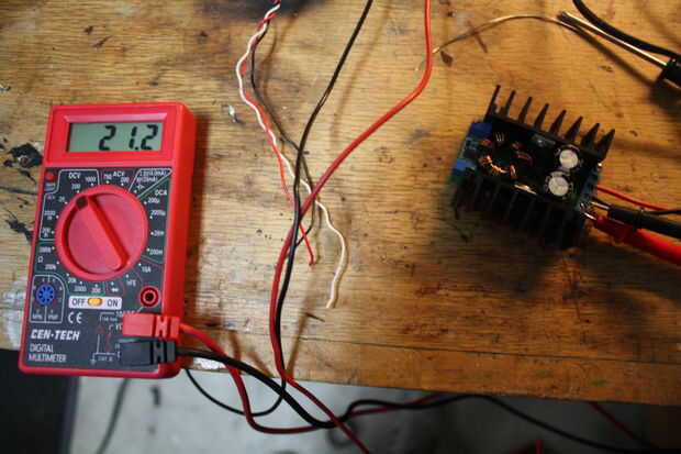 Conecte sus cables de prueba de multímetro en el terminal de tornillo hacia fuera, teniendo la precaución de asegurarse que no haya cortocircuitos. En mi convertidor, el regulador de tensión es la olla donde el tornillo está más hacia fuera. El regulador de corriente es la olla donde está más cercano del tornillo.