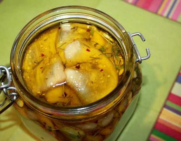 Para 2 tarros: 2 kg de berenjenas, cortar en rodajas 4 dientes de ajo, cortado en rodajas 1 L seco vino blanco 300 ml vinagre de vino blanco Orégano fresco Romero fresco Sal 1-2 chiles Aceite de oliva