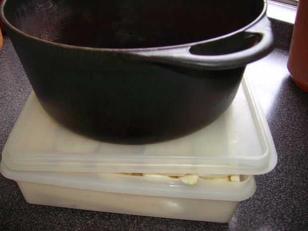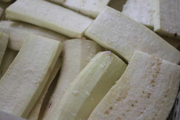 Capa de las rodajas de berenjena en un Tupperware amplia y espolvoree cada capa con sal. Poner un papel o una cubierta directamente sobre las berenjenas y poner algunas macetas muy pesados en la parte superior. Deja al menos 4 horas o durante la noche.