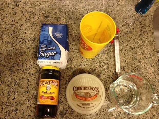 Cuando se pone por encima de 200° f el., le verá empezar a burbujear mucho. Cuando primero probé esta receta, mantiene hirviendo demasiado y nunca pude llegar a punto suave-crack, luego encontramos otra receta que incluye la adición de mantequilla, que era el secreto para mantener de ebullición para arriba demasiado alto. Si hierve para arriba demasiado alto, puede tratar de añadir más mantequilla. Se consigue muy caliente, así que ser muy cuidadoso!