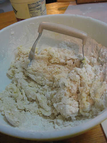 Usando un cortador de pastelería o un gran tenedor, tenedor hasta grueso.
