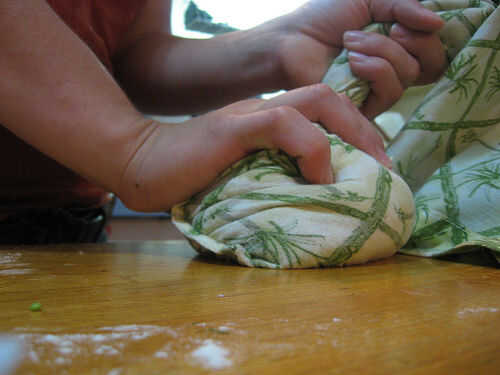 Masa floja y en una vieja funda de almohada que destinado sólo para hornear (Asegúrese de que quite cualquier pelusa de esquinas caja almohada. Generalmente hago esto con funda de almohada adentro hacia fuera). Masa articulado en caja de la almohadilla hasta que se forme masa bonito