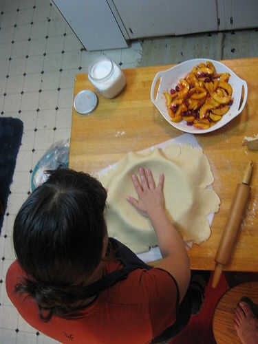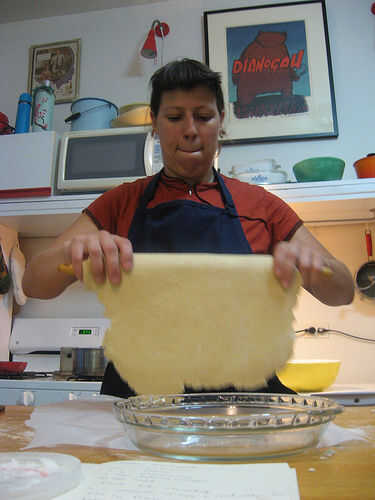 Balanceo de masa alrededor de rodillo (con papel sulfurizado para facilitar en), suavemente transferencia de masa a la tartera. Masa Pat hacia abajo en el contorno de la tartera.