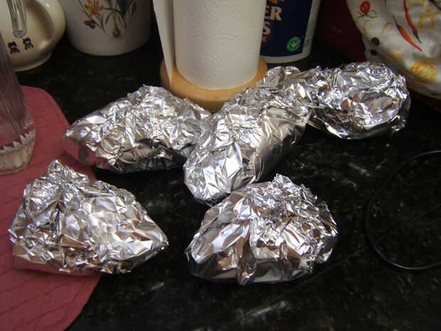 Ponerlos en el horno durante una hora a una hora y media. Llevarlos a cabo sólo cuando estén suaves a través de todo el camino. Usted puede decir cuando es uno sacando y pegando un cuchillo a través de él. Si el cuchillo rebana a través fácilmente, es evidentemente suave a través de todo el camino.