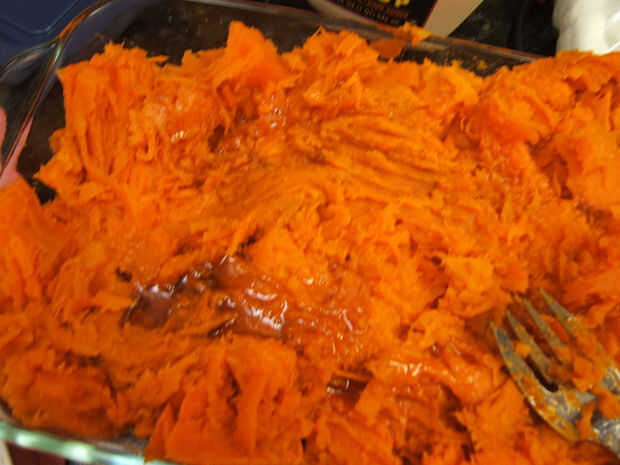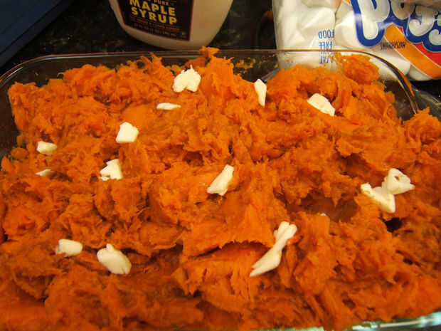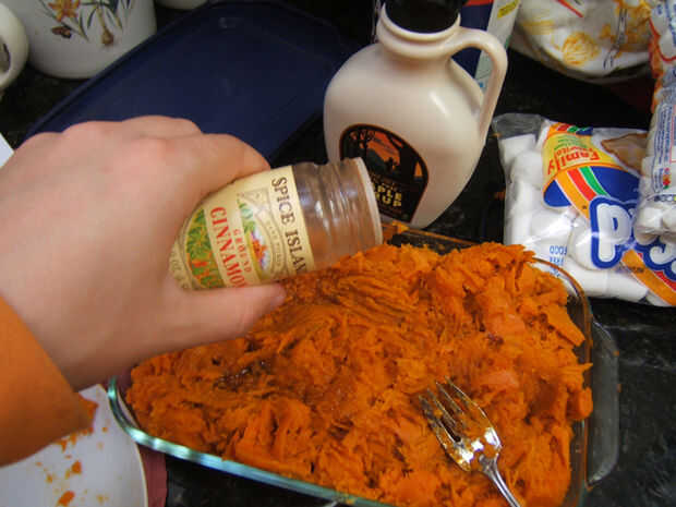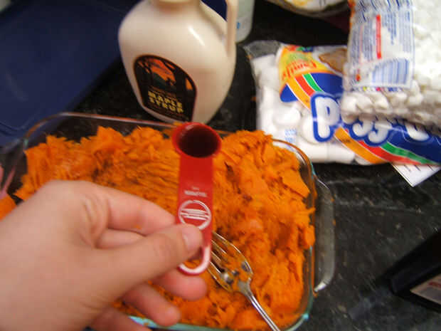 Una vez que su camote han sido sacado con pala hacia fuera, vas a puré los siguientes ingredientes en la cazuela: