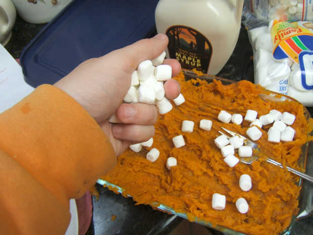 Tomar un puñado o dos de malvaviscos pequeños y mezclarlas a la cazuela hasta que está a lo largo (foto secundaria).