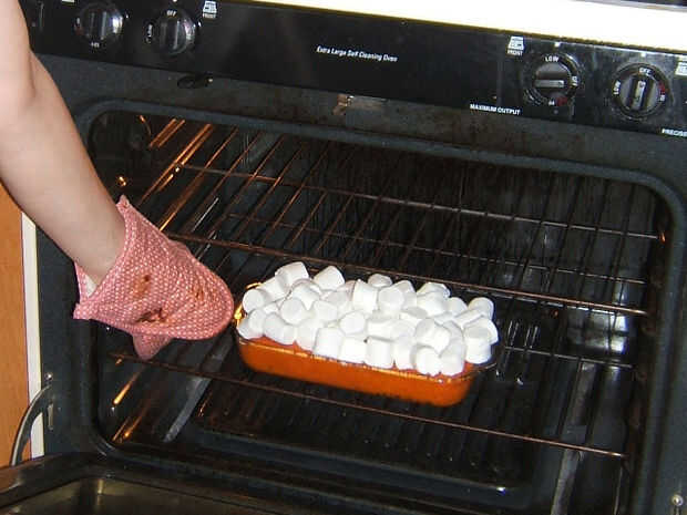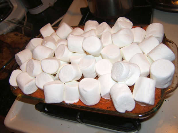 Sacarlo del horno y cubrir la parte superior de la cazuela con los malvaviscos grandes. No te preocupes de ser tacaño.