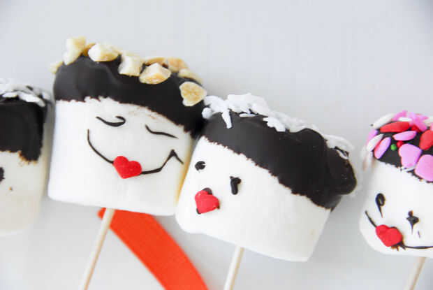 dibujar la cara con un palillo, bañado en chocolate y pegar un corazón con chocolate como boca.
