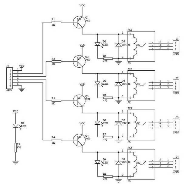 Al realizar esta tarjeta de relé utilizar esquemas como el de la imagen. Para usar los transistores BC556, 1n4005 diodo (que tengo en casa), relés con bobina de 12V.