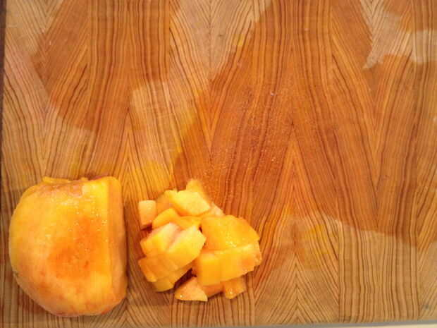 3. Vierta 1/4 taza de puré de melocotón en un suce a fuego lento y añadir la cúrcuma, azúcar, vino y gelatina. Batir los ingredientes rápidamente, asegurándose de que la gelatina está bien integrada. Puede que necesite añadir una cucharada o dos de agua.
