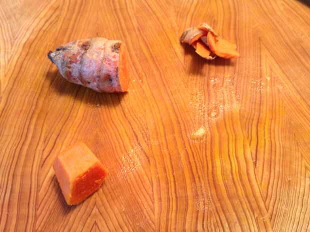 2. corte de una porción pequeña de cúrcuma. Cortar la piel y picar a la mitad de una cucharilla.