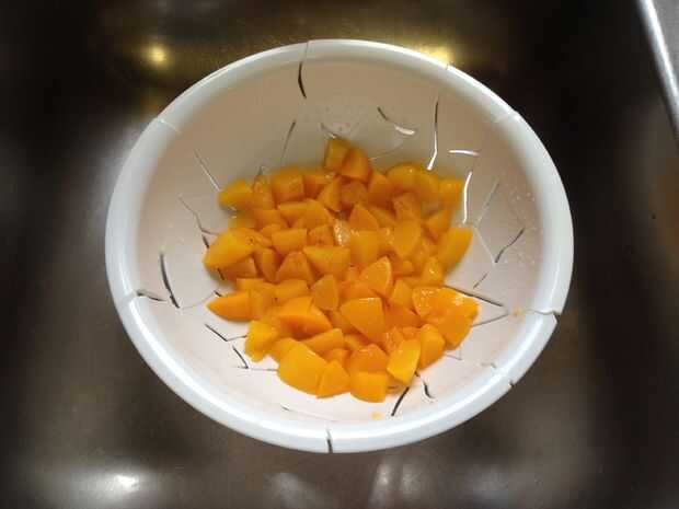 Abrir la lata de duraznos y drenar el jugo. Picar los melocotones y colocarlos en un tazón mediano y reservar.