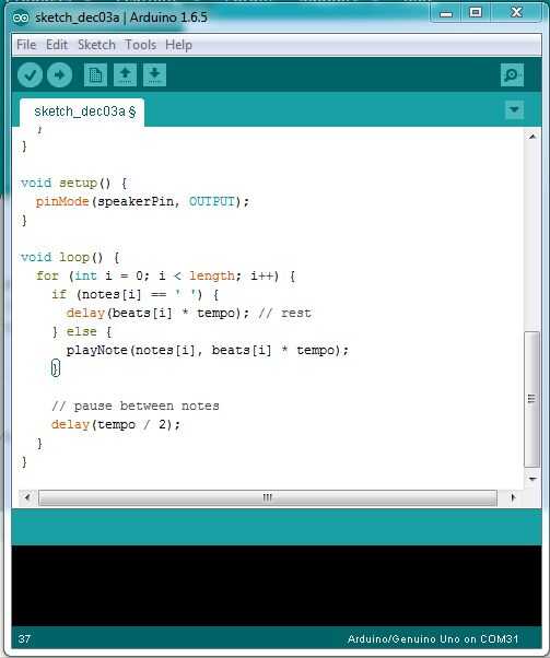 Aquí está el código general para cargarse al LinkIt, el código hace el LinkIt uno enviar una onda cuadrada de la frecuencia apropiada para el piezo, generando el tono correspondiente.