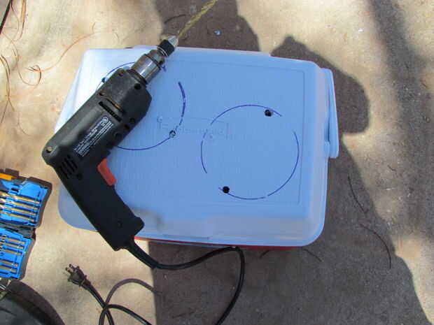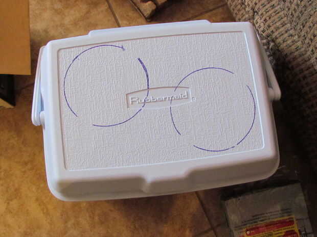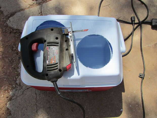 Una vez que los círculos fueron marcados, utilicé una broca grande para hacer un agujero de arranque para la sierra caladora. desea mantener el agujero en el interior del círculo. En realidad utilicé dos agujeros porque no quería estar girando alrededor de la nevera con el rompecabezas!