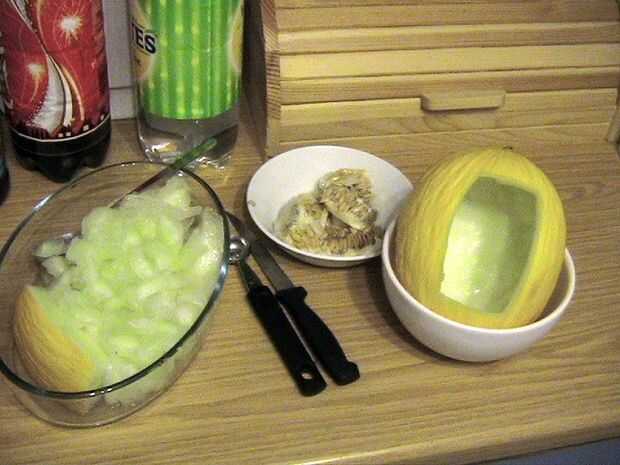 Debido a la intensa jugosidad de un melón, puede encontrar útil para enjuagar las tripas una vez finalizada esta etapa y pat el interior seco con una toalla de cocina. (Sé que hice).