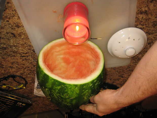 Velas utilizan fuego para la luz y el fuego requiere oxígeno y libera mucho calor. Para el oxígeno va a necesitar cortar un pequeño agujero en la parte superior de manera que puede respirar. Si la vela se mantiene saliendo entonces necesita un agujero más grande. Un agujero del tamaño de un cuarto y mina funcionó a la perfección. Ahora el calor se seca usted melón corteza más rápido. Esto probablemente hará su melón no duran tanto, debido al agua contenido en la corteza. Sugerí que usando vaselina para cubrir la corteza expuesta y la carne. Esto funciona bien con calabazas pero no he probado en el melón todavía. Sobre todo que me gusta este juego mucho. Produce una sensación agradable vela caliente.