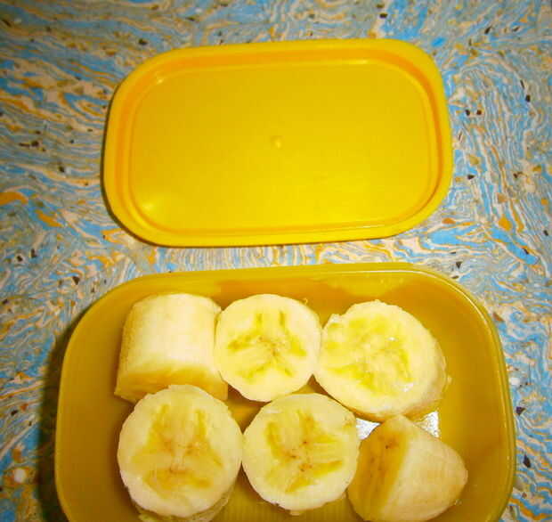 Vierta agua en la bandeja de hielo. Congelación para obtener los cubos de hielo. Rebane el plátano y colocarlo en un envase apretado del aire en el congelador durante 1 hora para conseguir congelados rebanadas de plátano.