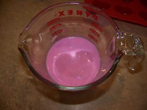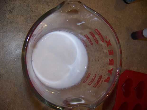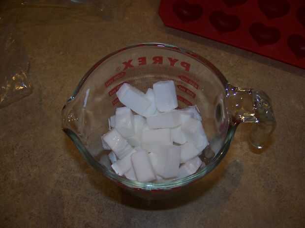 Si no lo has hecho ya, corta el jabón en cubos pequeños. Mina yo la derrito en el microondas. El envase de cristal utilizo demora de 1 minuto a 1 minuto 30 segundos para derretir el jabón completamente.