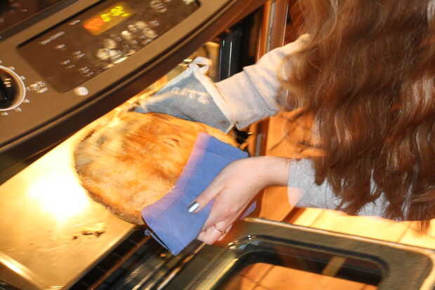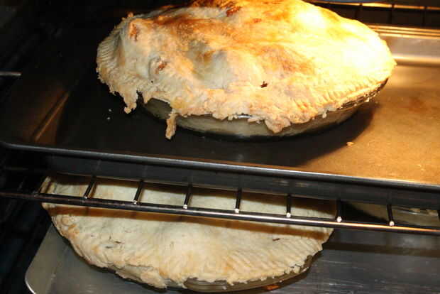 Lugar en el horno a 400 grados y cocinar por 50 minutos.  Esto resultará generalmente en un pastel con rebanadas de la manzana entera.  Si usted quiere las manzanas para romper más, cocinar ya con un pedazo de papel aluminio en la parte superior de la empanada para evitar que se queme.  Generalmente coloco una bandeja bajo el pie para recoger goteo zumo de manzana.