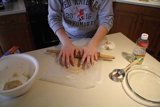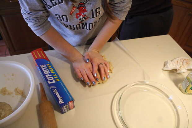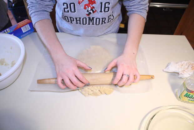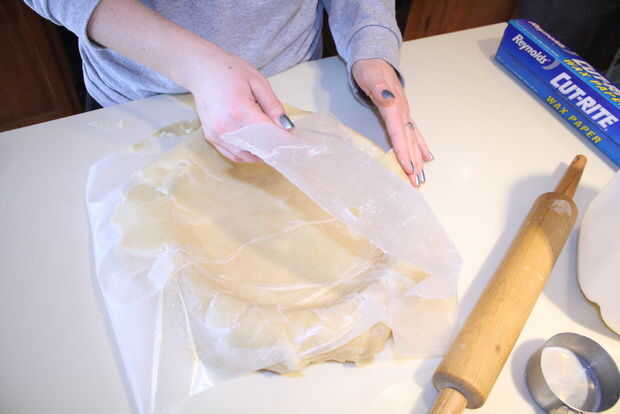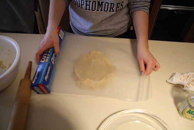 Tomar la bola más grande, colóquela sobre un trozo de papel de cera y aplanar en un disco de espesor con masa más cerca de los bordes.  Coloque más papel de cera en la parte superior y estirar la corteza hasta que es mayor que la placa de la empanada.  ¿Mencioné que desea ruede lo menos posible?