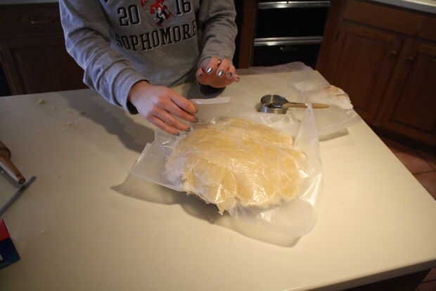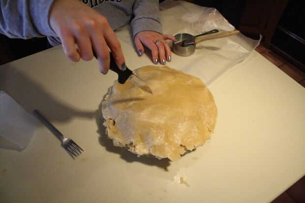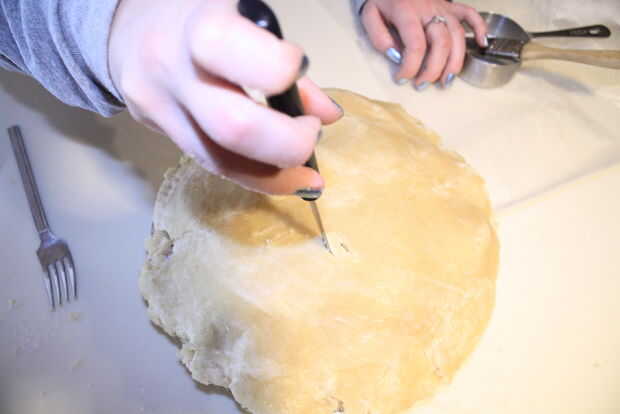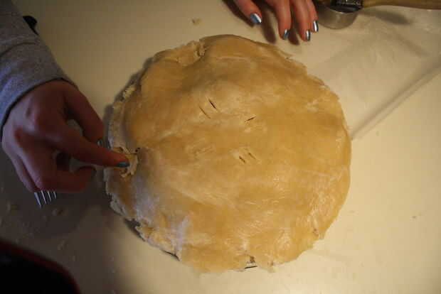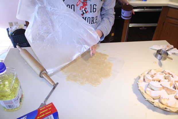 Rodillo hacia fuera de la corteza superior entre el papel encerado como antes.  No rodar demasiado!  Una vez que la corteza se coloca sobre el pastel uso un tenedor para prensar los bordes apretados, luego realizar unos cortes en la parte superior con un cuchillo.  Esto permite que algunos de la humedad de la fuga de las manzanas mientras cocina la tarta.