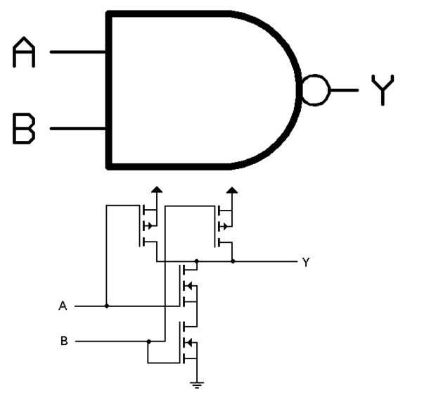 Requiere 4 MOSFET funcionar, P 2 canales y 2 canales de N en la configuración de abajo. Los FETs de canal P son en paralelo, pero los FETs de canal N se apilan para arriba, en una configuración de "Tótem". Si cualquiera A o B es bajo, entonces corriente puede fluir a través de uno de los el FETs de canal P, haciendo Y lógica 1. Esto es fiel a la tabla de verdad. Si ambos A y B son altas, entonces el p-canal FETs apagar y encienden ambos FETs de canal N, que lógica Y 0. Como fiel a la mesa.