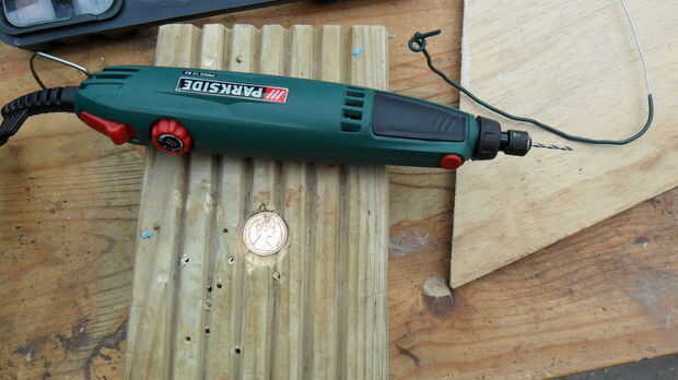 Ranura las monedas en el agujero y eligió el lugar para perforar - la parte superior del frente de la reina en cada caso. Puse una pequeña gota de aceite sobre el punto antes de utilizar una dremel para perforar para reducir la fricción y el calor (aunque la acumulación de calor era bastante impresionante).