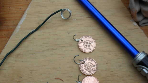 He despojado el plástico del cable y herida alrededor de un pedazo de metal (destornillador cambiable - calidad de basura pero una agradable mirada azul brillante) para formar un muelle. Luego había cortado los lazos de alambre con pinzas y deslizarse por los agujeros.