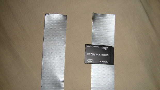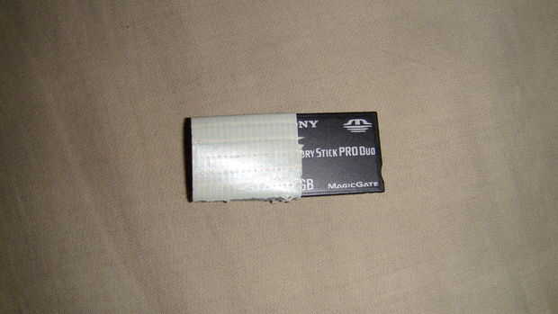 Tomar la tira de cinta adhesiva y enróllelo alrededor de la tarjeta de memoria, quieres ceñido, pero no a apretado. Un lado del rollo probablemente será más ancha final que no tienes al rodar. Se desea colocar ese extremo hacia el exterior.