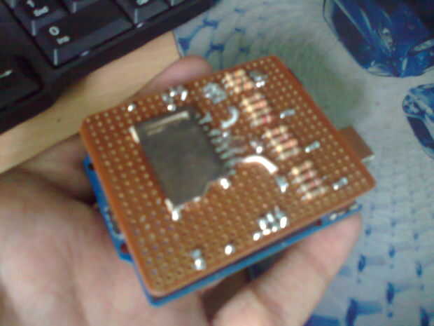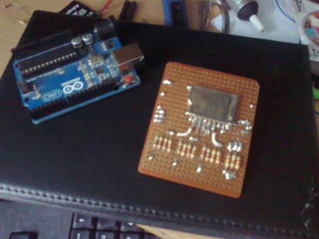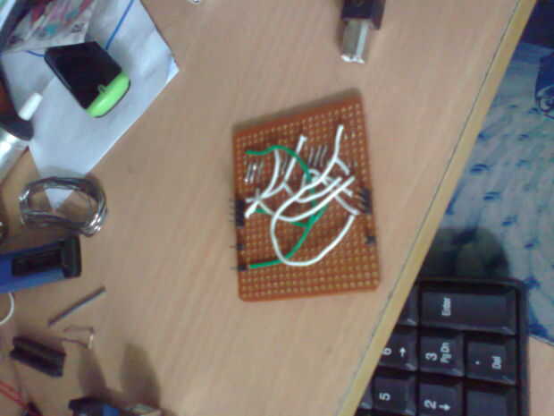 este circuito poco sienta bien ontop de una placa Arduino y te permite conectar rápidamente un ATtiny chip de programación usando la Arduino "lengua" y IDE para escribir el código y la placa Arduino como programador ISP para cargar el código en