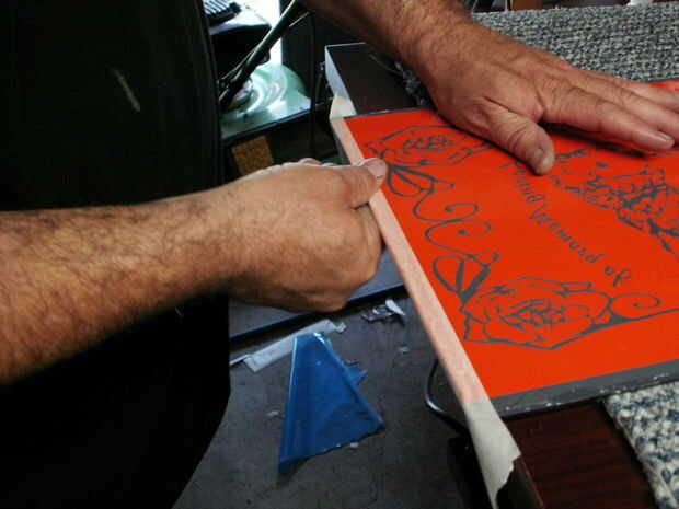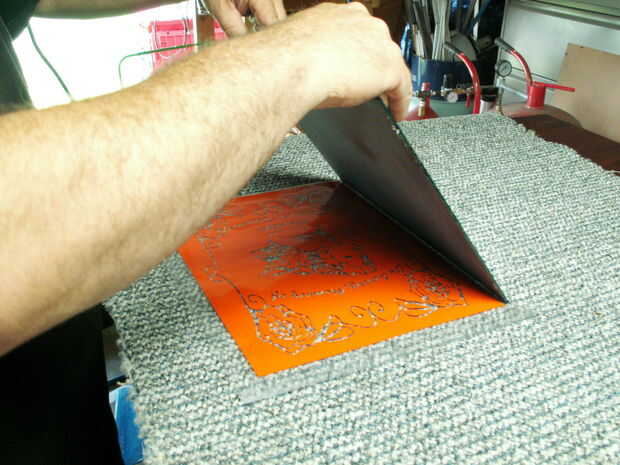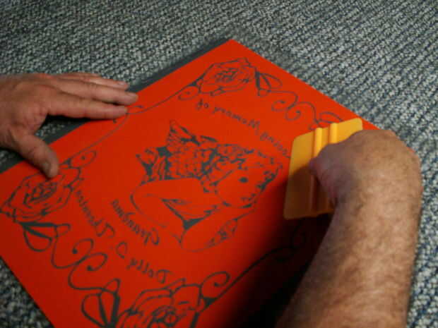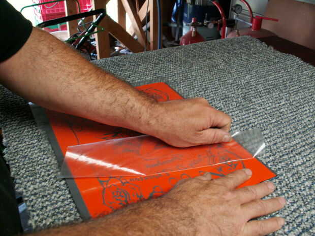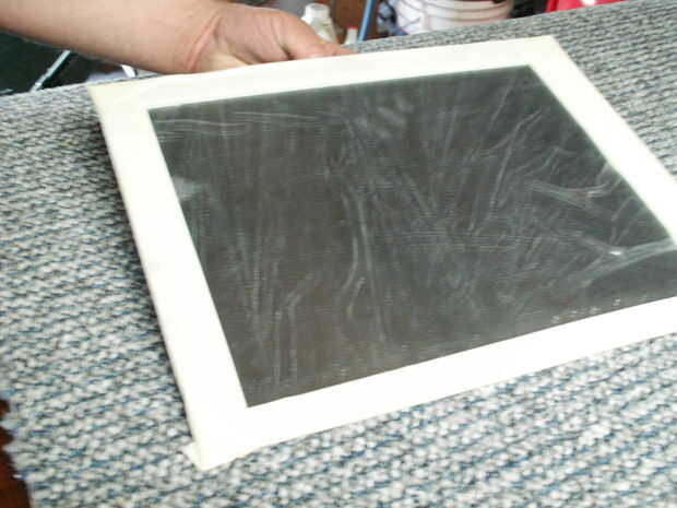 Aplique la cinta de transferencia usada hacia el cristal del espejo y use cinta adhesiva alrededor de los bordes esencialmente adjuntando el resto entero del espejo. En este punto la única superficie expuesta debe ser el desmalezadas parte del vinilo con el espejo forro expuestos.