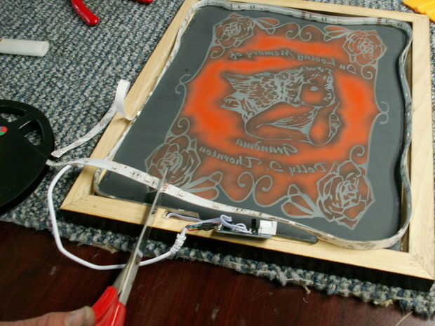 Retire el papel de forro adhesivo de la tira LED y presionar la cinta alrededor del borde de la parte interior del marco. Pegamento caliente la tira en lugar de aplicar un pequeña cantidad pegamento entre cada LED o sobre cada pulgada.
