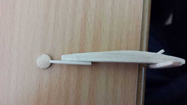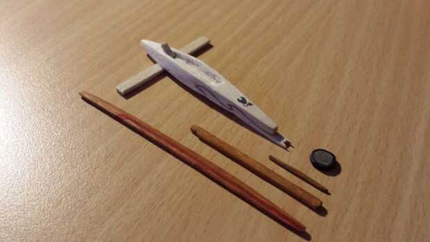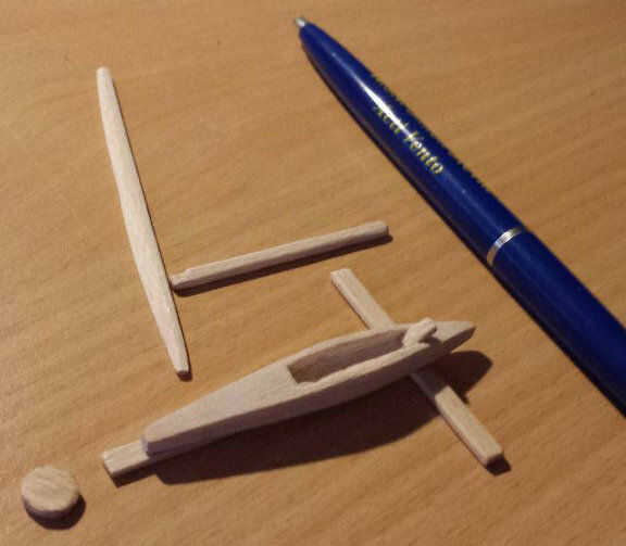 La madera de eran palitos pegados juntos para el fuselaje y palos solo para el resto. Utilizando un dremel y el cincel, al pedazos fueron hechos para el tamaño y forma correctos. La forma correcta fue una de las cosas para asegurar el reconocimiento por parte de otros miembros de la asociación. En algunas fotos se puede ver una barra de dirección, pero esta vara no hacerlo a la versión final, ya que no aporta nada. Después de formar todas las piezas todos consiguieron su figura. Usé lápices de colores y marcadores para hacerlo. Dos características principales de Duvel D'n son las llamas en el lado y el diablo en la parte superior. Antes de teñirlo, hice estas formas (esquemas) con un lápiz negro.