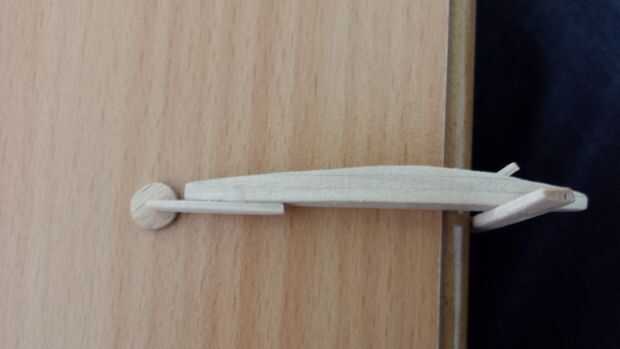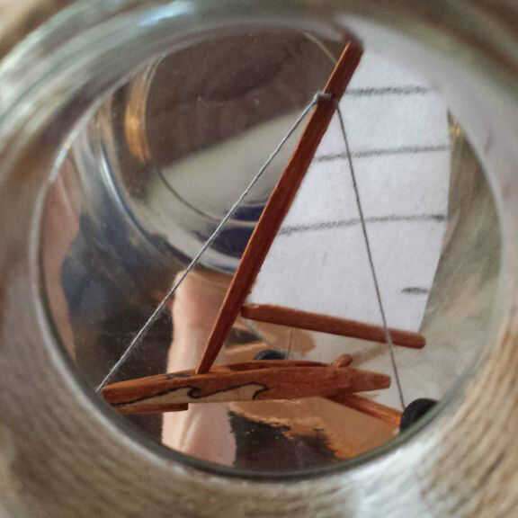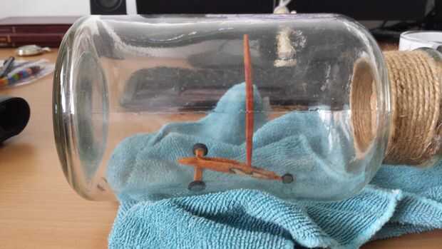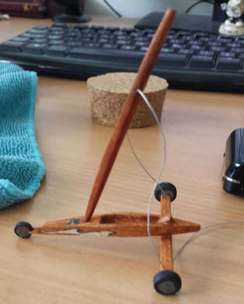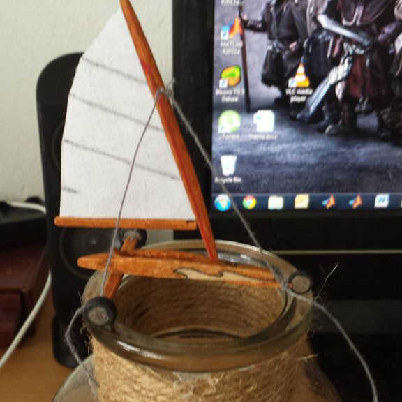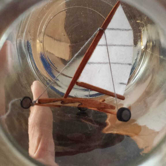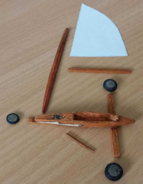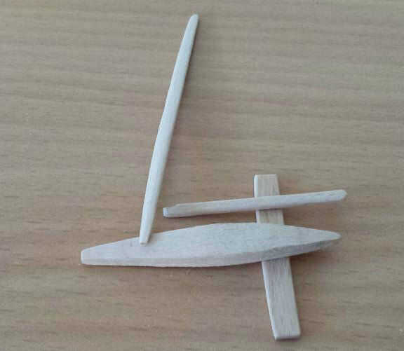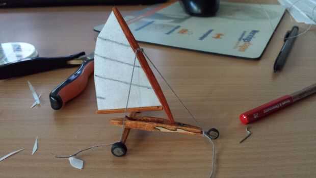 Después de todos los colores, incluyendo el hilo de rosca que era blanco, era hora de armar el barco de tierra. Empecé con el pegado de la vela al mástil y la botavara a la vela. La parte delantera y posterior corredor tablones estaban pegados al fuselaje y las ruedas estaban pegadas a las tablas del corredor. El respaldo de la silla fue pegado dentro del fuselaje. Cuando este pegamento se seca, las estancias, de hilo, fueron pegadas así y el yate de la tierra se terminó.