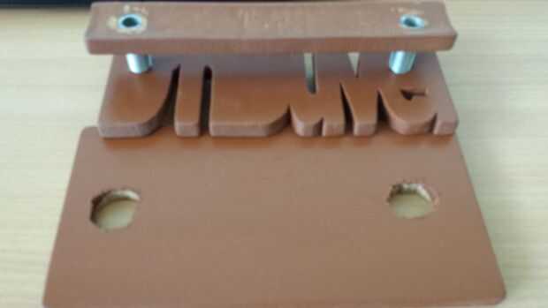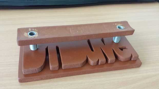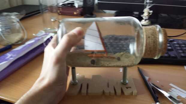El stand fue construido en muy poco tiempo de mdf. El texto "D'n Duvel" fue recortado a tocado así que todas las letras. Este texto fue impreso y trasladado al mdf. Una vez en el mdf se cortó con una sierra de mano (Sierras de marquetería?). Una pieza cuadrada fue cortada para poner en el texto, y otra pieza fue cortada y acanalada para sostener la botella. Como el barco de tierra original era marrón, decidí pintar la base marrón. Cuando la pintura se había secado, un perno se inserta en el texto y en la pieza ranurada (yo usé un tubo roscado que encontré). Se perforaron dos agujeros en la pieza cuadrada para sostener las cabezas de los pernos.