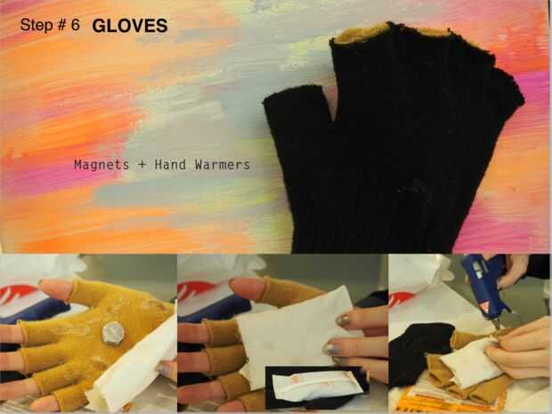 Poniendo el imán dentro de los guantes y otra capa para colocar la almohadilla de la mano caliente.