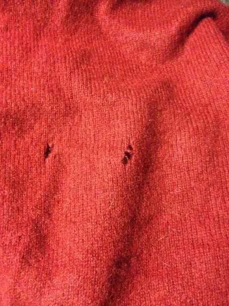 Ah, refrigerador tiempo... tiempo de cambiar el armario. Bueno, descubrí algo cuando Desempaque mis suéteres: agujeros! Uno de mis favoritos es un "muerto de hambre" me compré un par de años atrás en la salida de Marina de guerra antiguo Atlantic City NJ. Es 100% cashmere, y lo compré en venta por menos de $10. Era tan agradable... suave, cálido y acogedor.