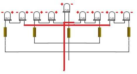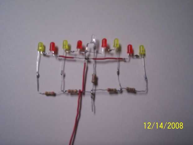 Observe la diferencia entre el diagrama de dibujo y la foto actual (mala foto, ya sé) de donde se sueldan los cables negativos. Por accidente, había soldado las resistencias para par fuera de serie en lugar de paralelo. Mientras todavía trabajaba mi circuito, el par exterior era significativamente más dévil que los otros. Nota a sí mismo... recuerda la próxima vez de la ley de ohms.