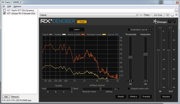 Parte de la meta de este proyecto es tratar de mantener la integridad del sonido, quitando y cambiando lo menos posible. Que dijo, es una mierda de ruido de la habitación, y la impresión 3D es una muy ruidosa habitación debido al aire filtrado de sistemas vas más o menos constantemente. Para quitar el rugido sordo de fondo de algunas de las muestras de contacto, utilizar filtros FIR (específicamente, ReaFIR o Izotope Rx4 Denoiser). Estos le permiten construir un filtro que "aprende" qué ruido suena como en una muestra y luego lo elimina de toda la muestra. No es perfecto por cualquier medio, pero con algún ajuste le permite afinar en lo que estás buscando. Si que no quieres ir a la ruta VST, hay un instructivo para hacer retiro del ruido en la navaja suiza de código abierto de edición, audacia de sonido: