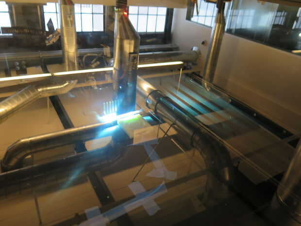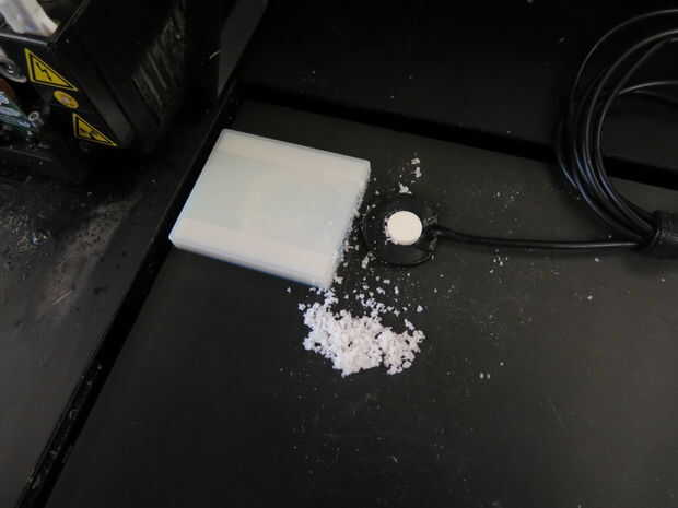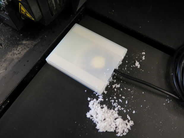 - Limpiar el modelo aunque dejándolo pegado a la cama. Esto fue trabajo desperdiciador de tiempo, más incómodo, ya que teníamos tal vez 240 micras (~1/100th de pulgada) digno de material por encima de lo que no queremos romper. Usando una combinación de raspadores, paciencia y un vacío, tenemos la mayor parte del material hacia fuera.