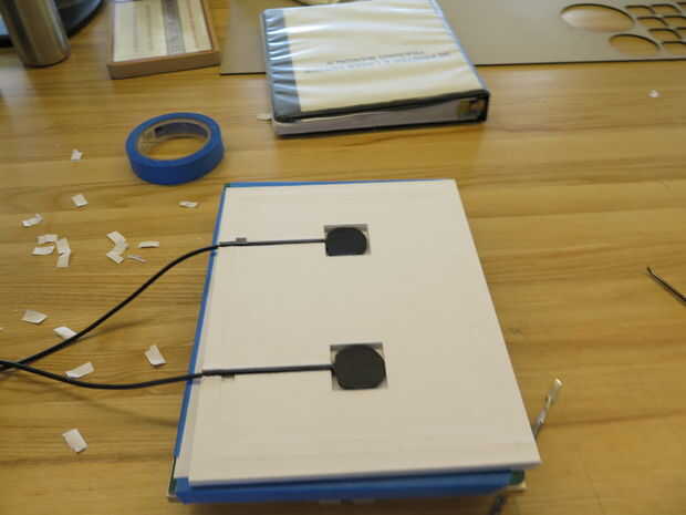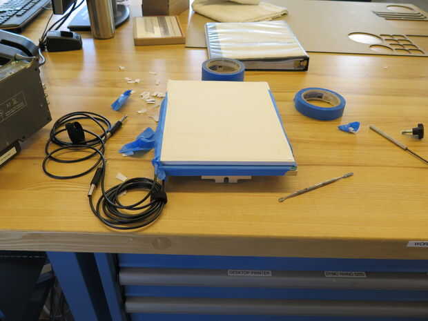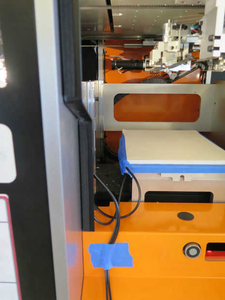 Entonces el problema era conseguir los cables de la máquina. Esto tomó un montón de pruebas con los cables en lugares diferentes con cinta azul, para asegurarse de que había suficiente holgura para la plataforma para moverse, sin los cables quede atrapados o en la forma de la cabeza de corte/pegamento de montaje. Tengo suerte en el hecho de que el pestillo de la puerta permite espacio entre la puerta y la máquina (como se ve en las imágenes por mí pegando mis dedos debajo de la puerta), lo pude ejecutar el cableado de micrófono en la parte delantera a mi grabadora.