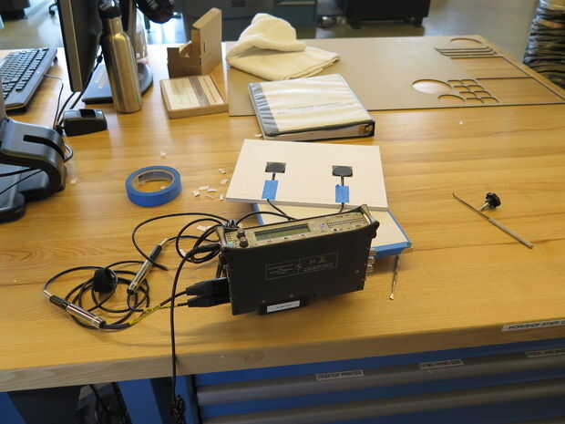 Ya que no pude resistirme a lanzar más micrófonos en la máquina, también he añadido uno de los Sennheiser mkh8040 cardioides, montados sobre una placa al lado del papel de mecanismo de carga. El cabezal de impresión está muy cerca del micrófono, pero no golpea. Una vez más, pura suerte, pero esto me permite llegar a más de los encantadores sonidos motor de la máquina mientras está funcionando.