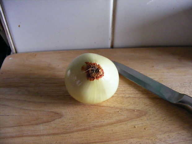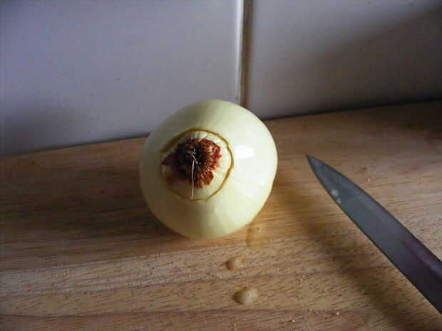 Empezar por Insertar punto de cuchillo de su cocina la cebolla a un lado de la zona endurecida. Con cuidado haga una incisión circular alrededor de la raíz (cuadro 3).