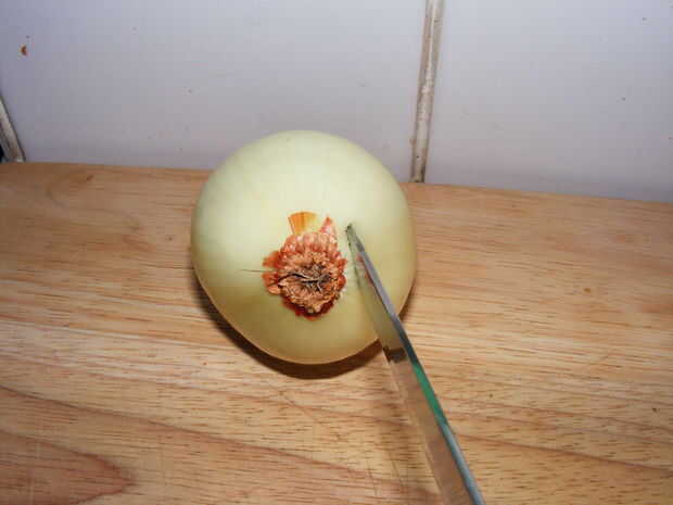 En la base de la cebolla se puede ver la raíz endurecida que estará cortando alrededor. Si nos fijamos en el cuadro 3, notará que he dejado una pequeña distancia entre el borde de la raíz que es visible y donde hice mi incisión. No traduce muy bien en la foto no hay mucho para medir tamaños de contra, sin embargo, es aproximadamente 1/8"(aprox. 3mm). Así que si su descorazonador es bastante estándar y muy ligeramente más grande que el área de raíz endurecida, no veo ninguna razón por qué esto no funciona.