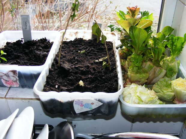 La foto es parte de nuestra ventana de la cocina. Las lechugas de la derecha son sólo los fondos de las lechugas a aproximadamente una pulgada de agua. En el frente se puede ver cómo empezar. Mientras que hacia la parte posterior, muestra cómo se ven después de unas semanas de crecimiento (la más grande del lote ha crecido tres semanas a partir de esta imagen.