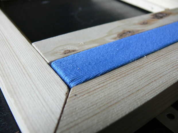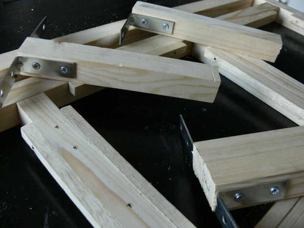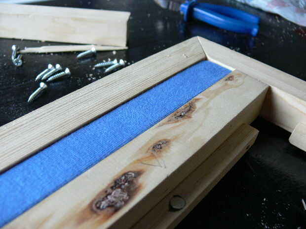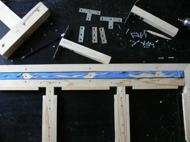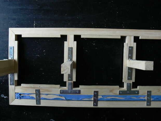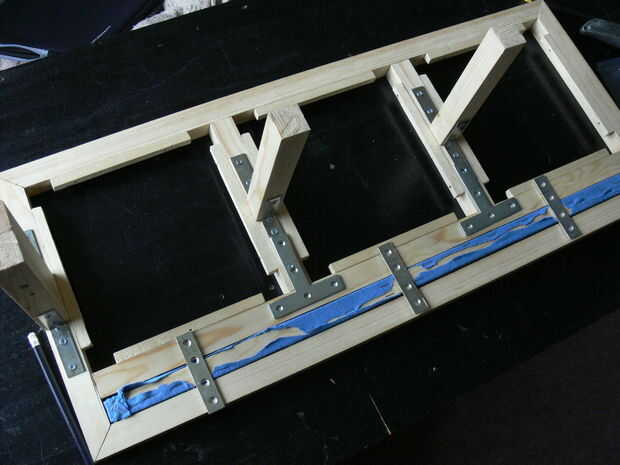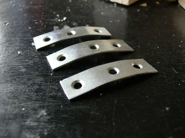 Aún así, la tela sentó demasiado cuando todo se armó, un milímetro o dos encima de la superficie de la mesa de pie. Yo quería un descanso, así que primero utiliza un martillo para doblar las placas en una suave forma de U. THT ayudó, aunque cuando atornillada detrás tiraron ligeramente recto otra vez y la batuta sentó todavía demasiado alto. Fósforos para hacer algunas cuñas de ajuste fija, creando una leve hendidura (imágenes 11 y 12).