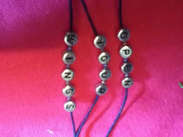 Del hilo de rosca los granos carta en orden para que la primera palabra va en el hilo más corto y la última palabra va en el hilo más largo. Esto significa que cuando usted lo usa cada palabra cuelgue un poco más bajo para que pueda leer el mensaje.