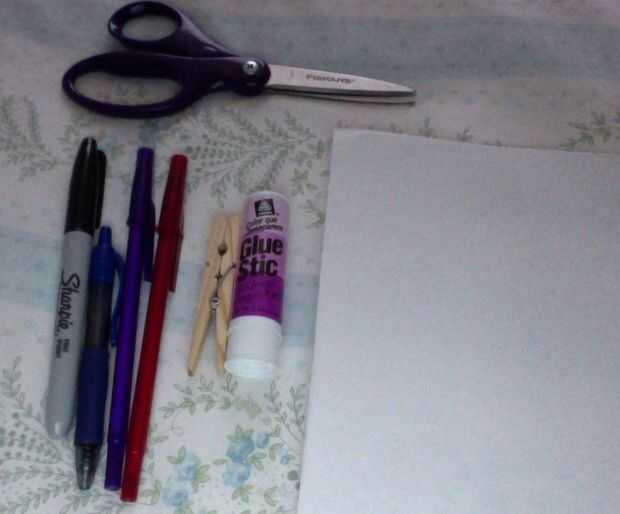 este proyecto es fácil y rápido! También es un bonito regalo para un ser querido. Nadie puede hacer este proyecto!Paso 1: materiales Necesita un pin de ropa, botella de pegamento, tijeras, papel, notecard y rojo, azules y negros plumas. (Palillos del